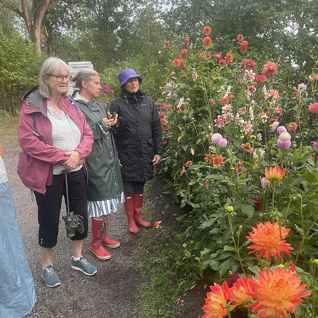 Vi var några entusiaster som trotsade åska och regn för att ta oss till Dahliaparken vid Enskede Gård en torsdag i augusti. Som tur var slutade det regna när vår ciceron för kvällen Lilian skulle börja prata om sin passion dahlior. På en liten plätt odlar Dahliaentusiasterna www.dahliaentusiasterna.se otroligt många sorters dahlior. Vi fick lära oss att det finns 50 000 olika sorters dahlior och de delas in i olika grupper. Bl. a. dekorativdahlior, pompom, fransblommiga, anemonblommiga, stjärnblommiga och många, många fler. Man kan ta sig dit när man vill och titta på dessa fantastiska blommor. Dahliorna finns att beskåda under hela september och en bit in i oktober. Adressen är Enskede gårdsväg 14 d och det är gratis.