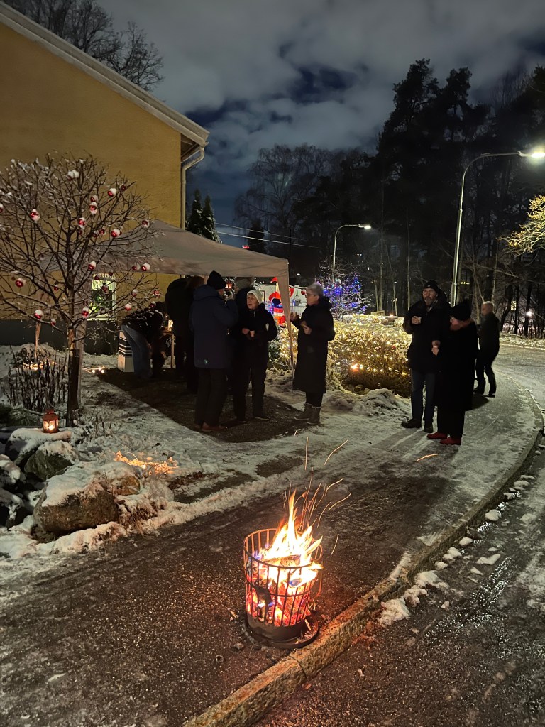 Torsdag kväll 5 december var vi ett påbyltat gäng som träffades i Tina och Leifs trädgård. Vi drack glögg och avnjöt olika godsaker medan vi tittade runt i trädgården som var vackert upplyst.