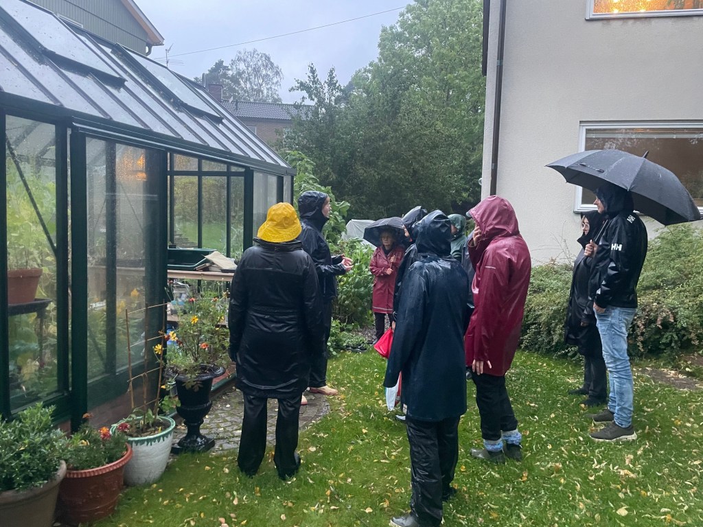 Trädgårdsmänniskor är ett folk av segt virke – men det vet vi väl. Det märktes på vår senaste trädgårdsrunda där regnet var ihärdigt och blåsten intensiv. Det var ett entusiastiskt gäng som trotsade vädret och som besökte tre trädgårdar med sinsemellan olika växthuslösningar. Mycket inspirerande! Därtill fick vi se de tillhörande vackert planerade trädgårdarna. Rundan avslutades med mysigt fika i det sista växthuset där mörkret till slut föll utanför rutorna och värmen innanför steg.