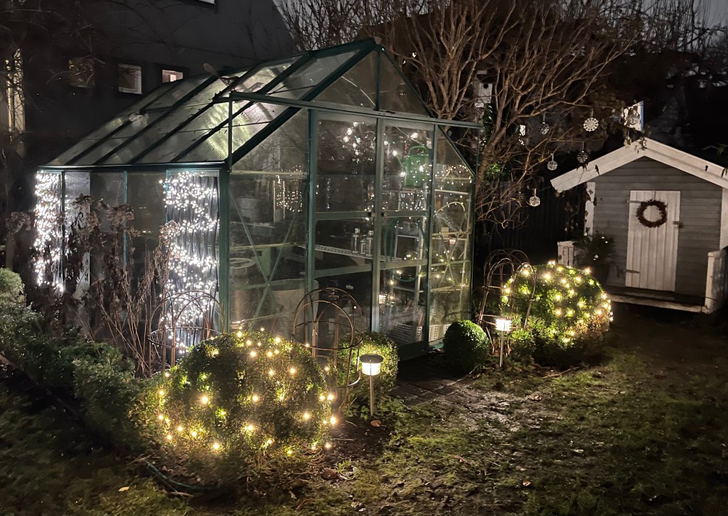 Besök i julpyntad vinterträdgård