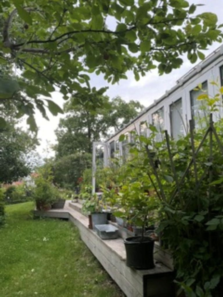 Huset är från 1929 men tomten var mest bara gräsmatta när vi flyttade in i huset för 18 år sedan. Bland det första vi gjorde var att fylla ut tomten med en stödmur för att få en mer lättillgänglig tomt. Vi har också byggt ett uterum på 30 m2 som sitter ihop med huset som man kommer in i direkt från köket. I uterummet är det en djungel av växter från medelhavet citron, oliv, granatäpplen, passionsfrukt, vindruvor, bougainvillea, jasmin, blyblomma, aprikos och massor av pelargoner men också en sittplats och bambubar.